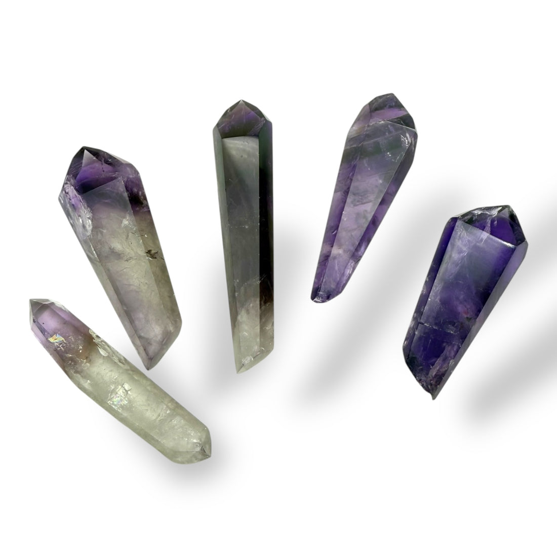 Estas puntas de amatista presentan una base en bruto y la punta cuidadosamente pulida, lo...