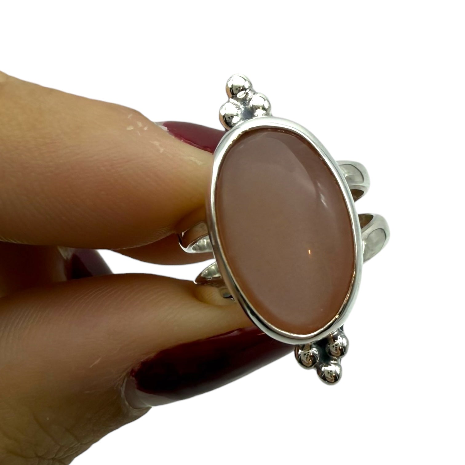 Descubre la delicadeza y la calidez de esta Piedra Luna melocotón, engarzada en plata de ley 925 con detalles artesanales hechos a mano.