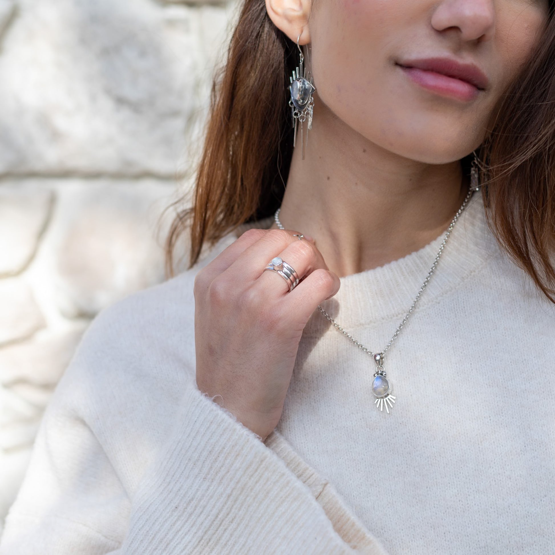 El Anillo Phoebe es una joya delicada y poderosa, que combina elegancia, minimalismo y significado espiritual. Formado por tres finos aros de plata pegados entre sí con armonía, este anillo se corona con una Piedra Luna natural, símbolo de intuición, claridad emocional y renacimiento personal.
