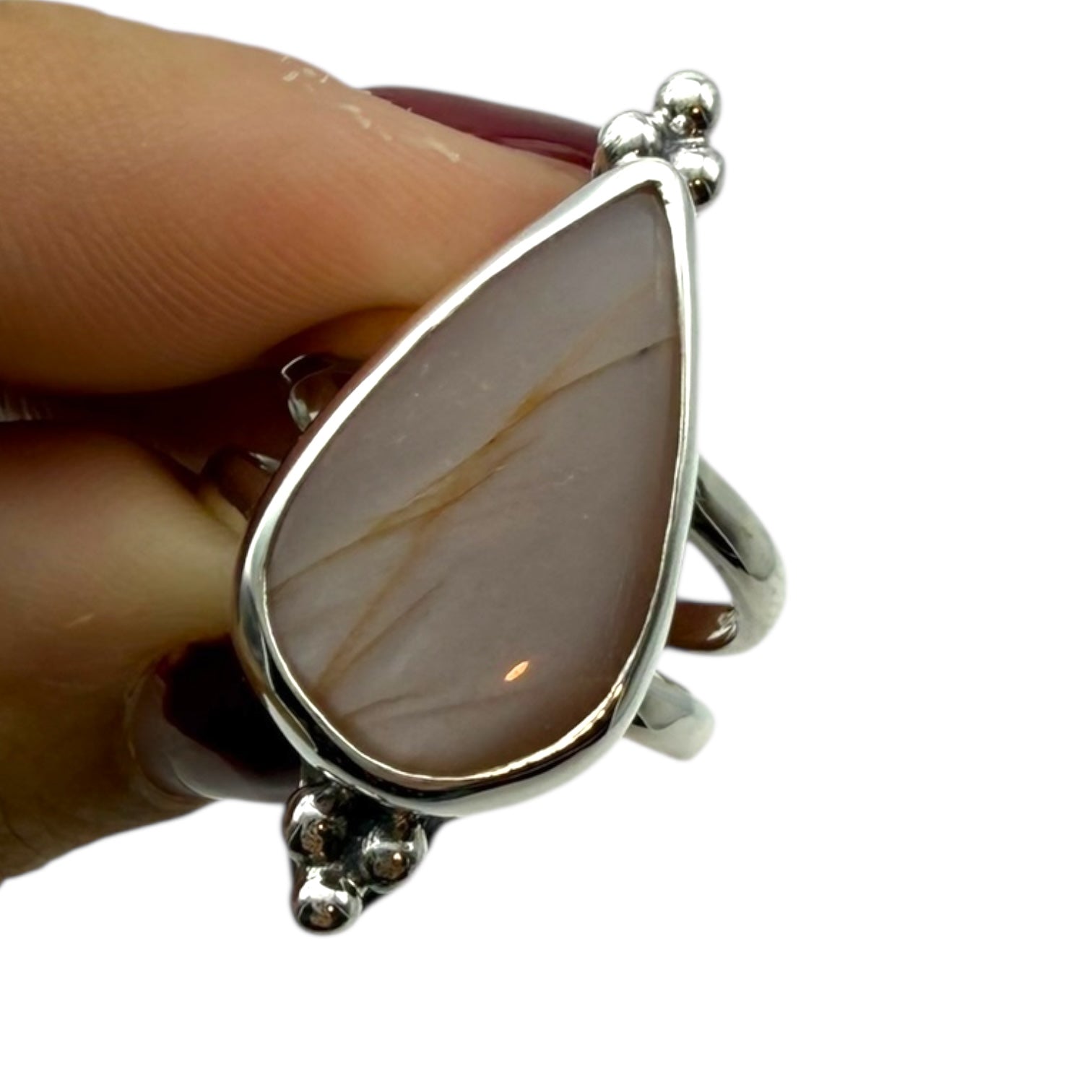 Descubre la delicadeza, la calidez y la magia sutil de esta Piedra Luna melocotón, engarzada en plata de ley 925 con adorno artesanal hecho a mano.