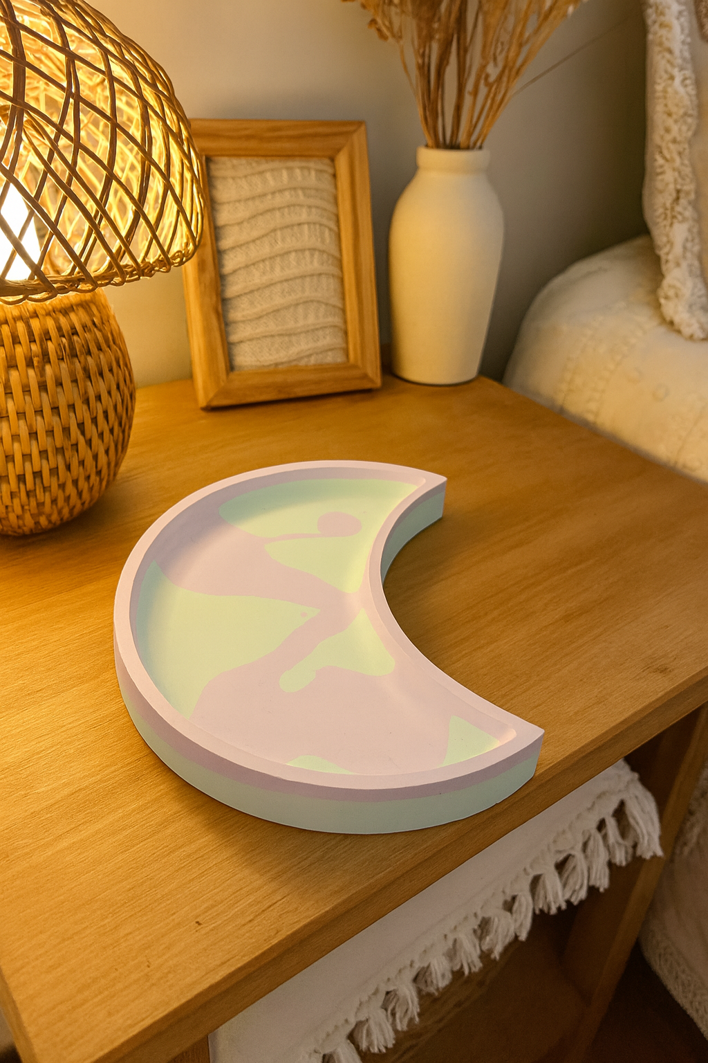Tener una bandeja lunar en tu espacio es una forma de honrar tus propios ciclos y mantener tus objetos más significativos en un lugar lleno de intención y belleza.