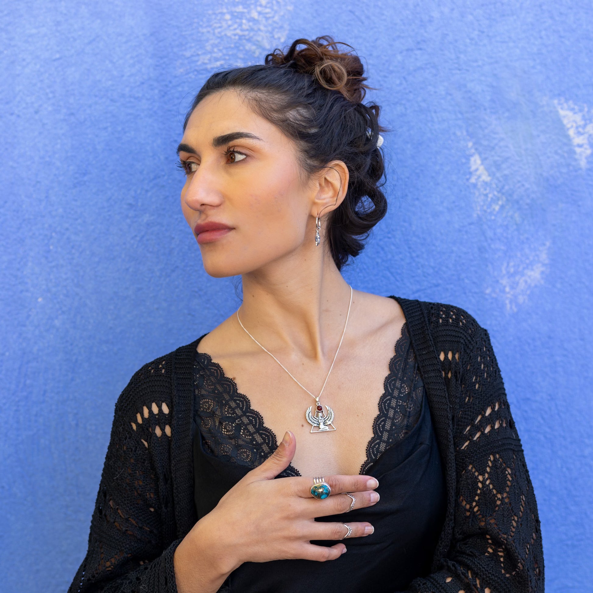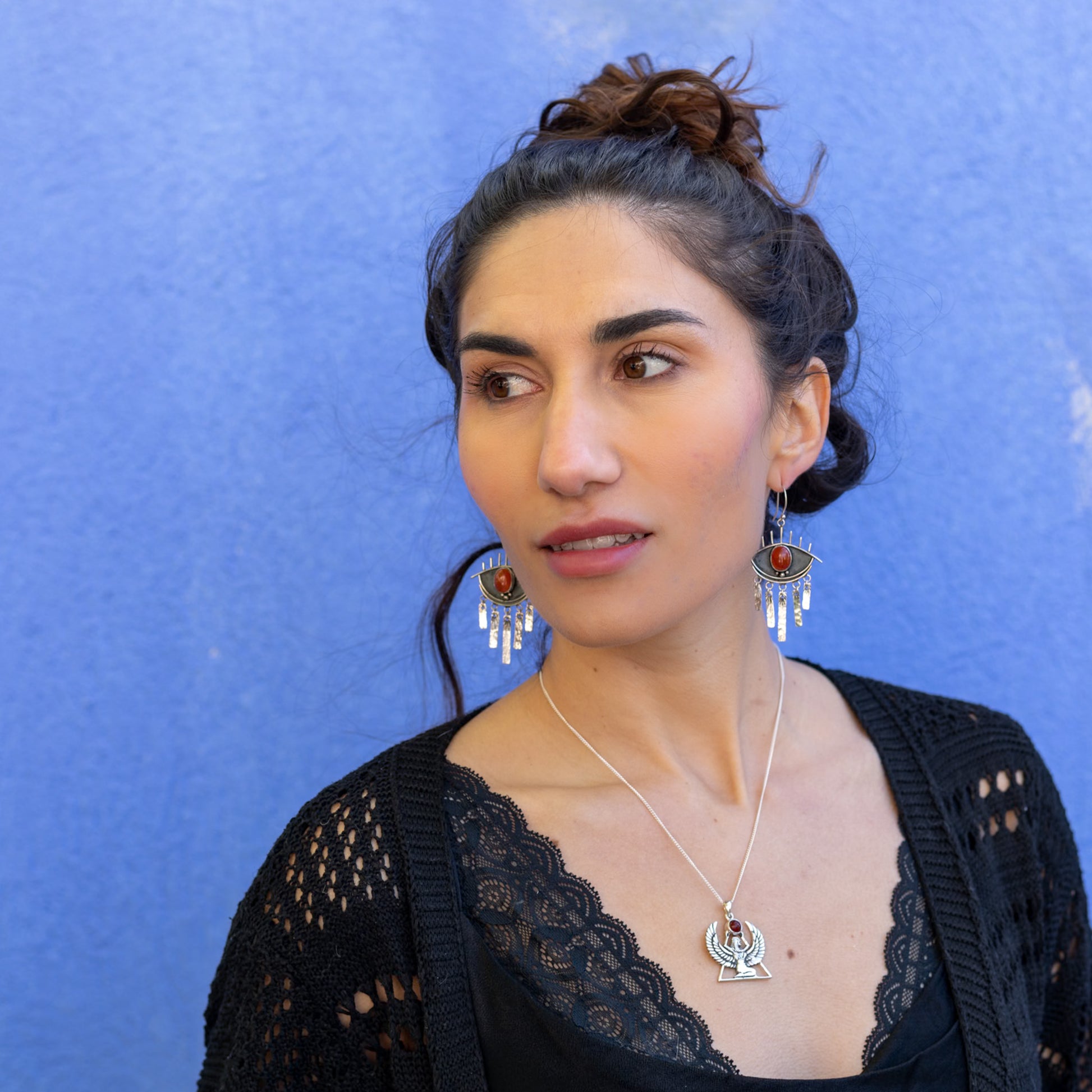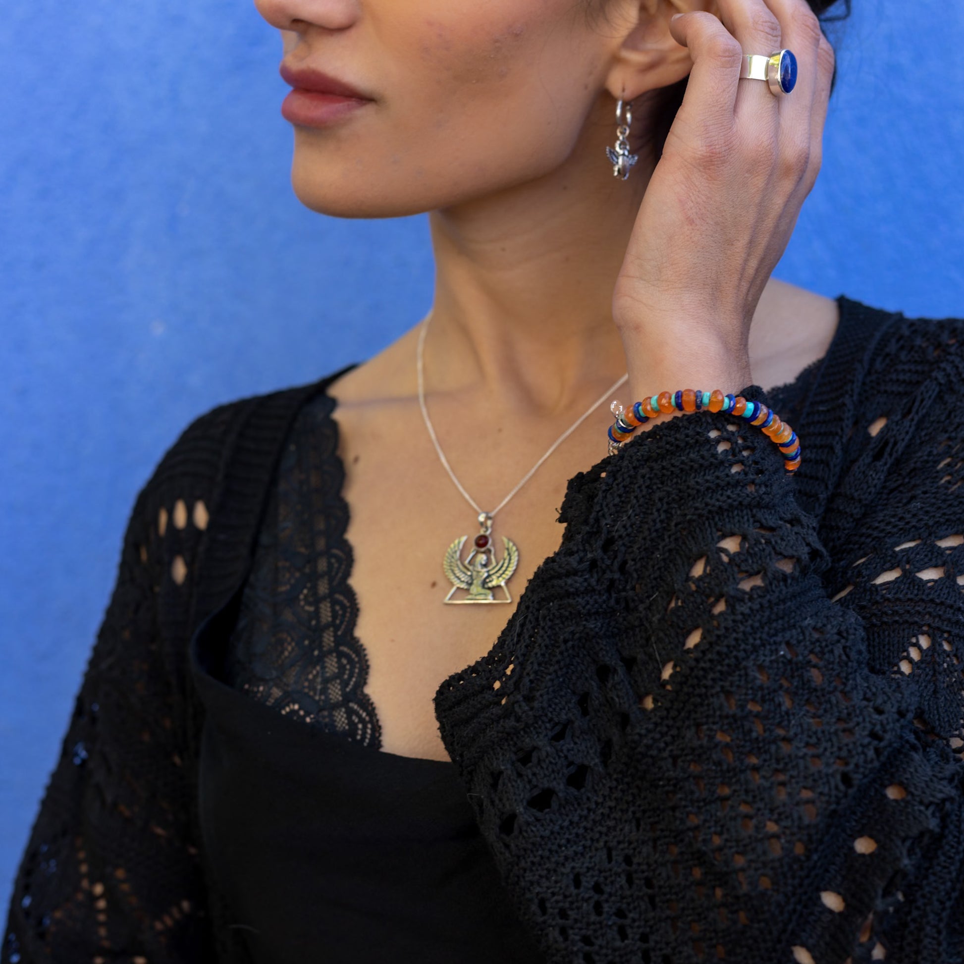 El Collar Isis es una pieza creada para honrar a la Gran Madre de Egipto: Isis, diosa de la magia, la protección, la sanación y el renacimiento. Diseñado y elaborado por nosotras, este colgante es un amuleto de fuerza femenina, conexión espiritual y poder ancestral.