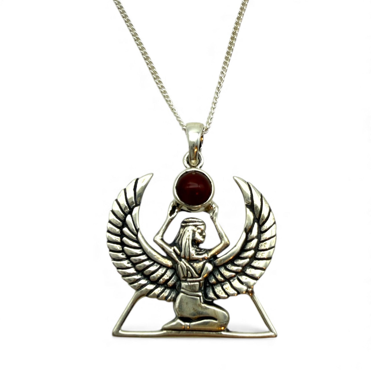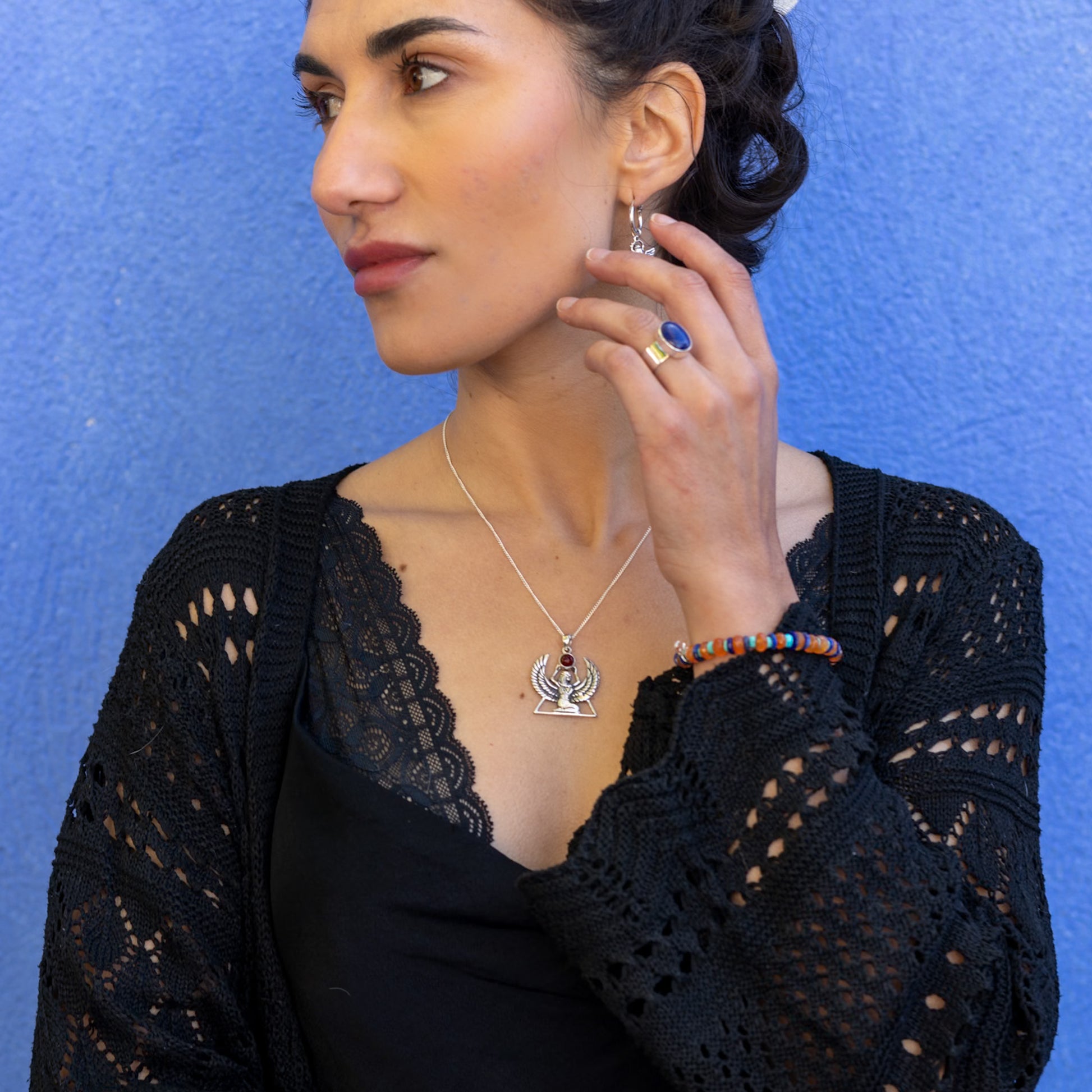 En el centro, Isis despliega sus alas en gesto de protección y bendición, envuelta por un triángulo sagrado, símbolo de manifestación, ascensión y equilibrio entre cuerpo, mente y espíritu. Entre sus manos sostiene una bolita de carneola de 4 mm, piedra del fuego interior, la creatividad y el valor.