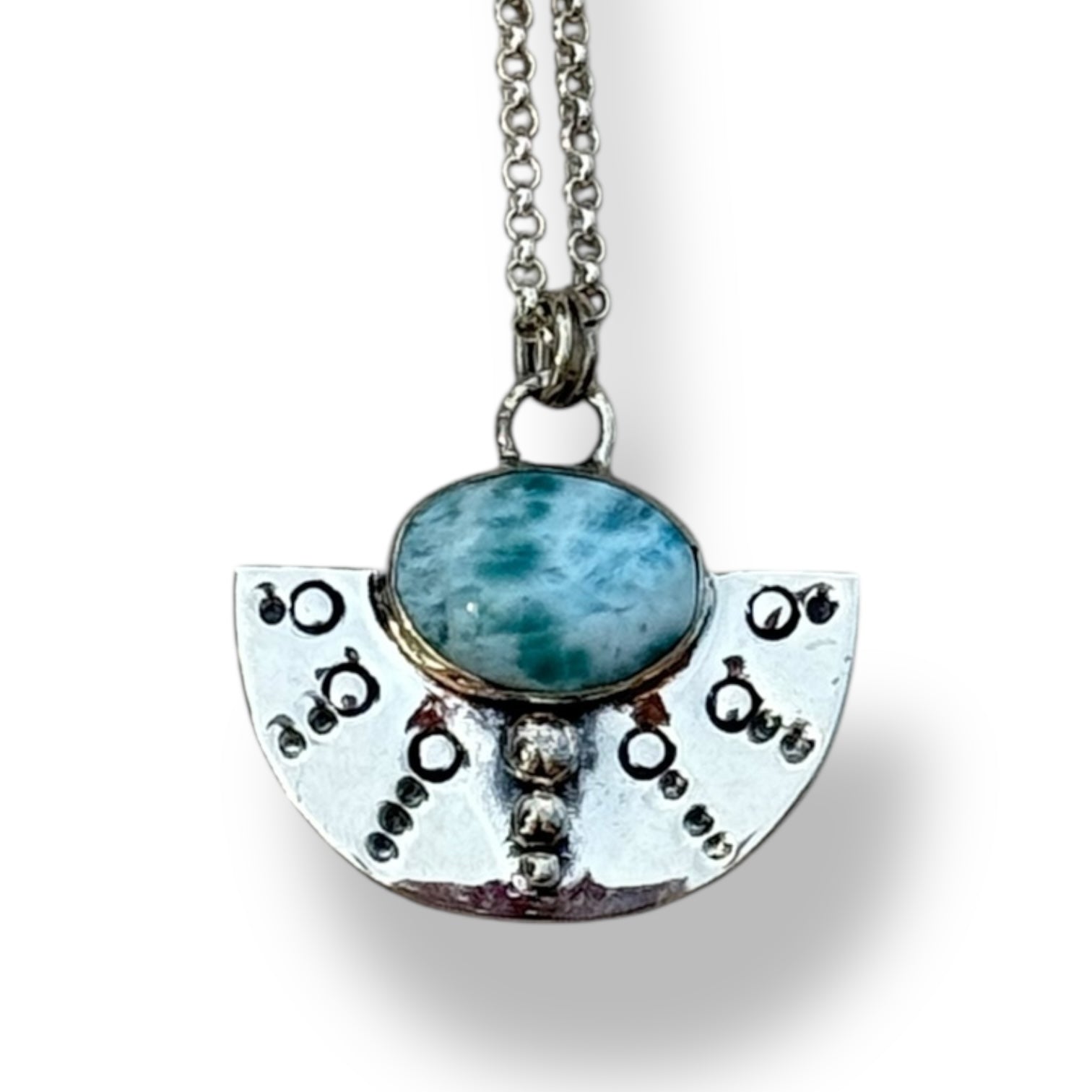 El colgante está protagonizado por una piedra ovalada de larimar de 20 x 10 mm, rodeada por una media circunferencia de plata con delicados grabados circulares en relieve que aportan simbolismo y distinción. Se completa con una cadena de plata de ley 925 de 50 cm, resistente, elegante y cómoda de llevar.