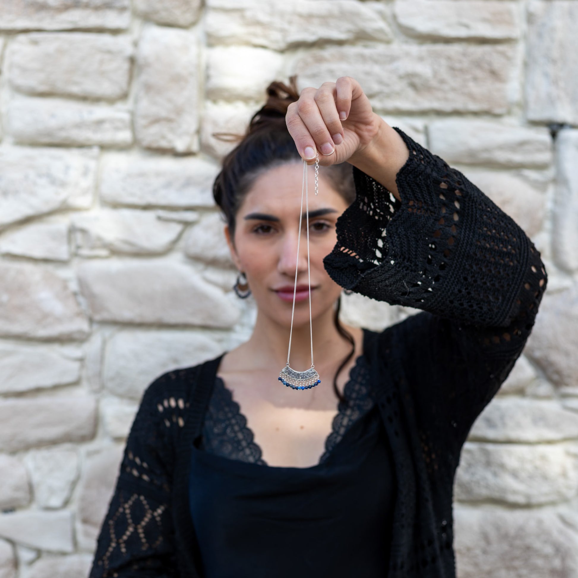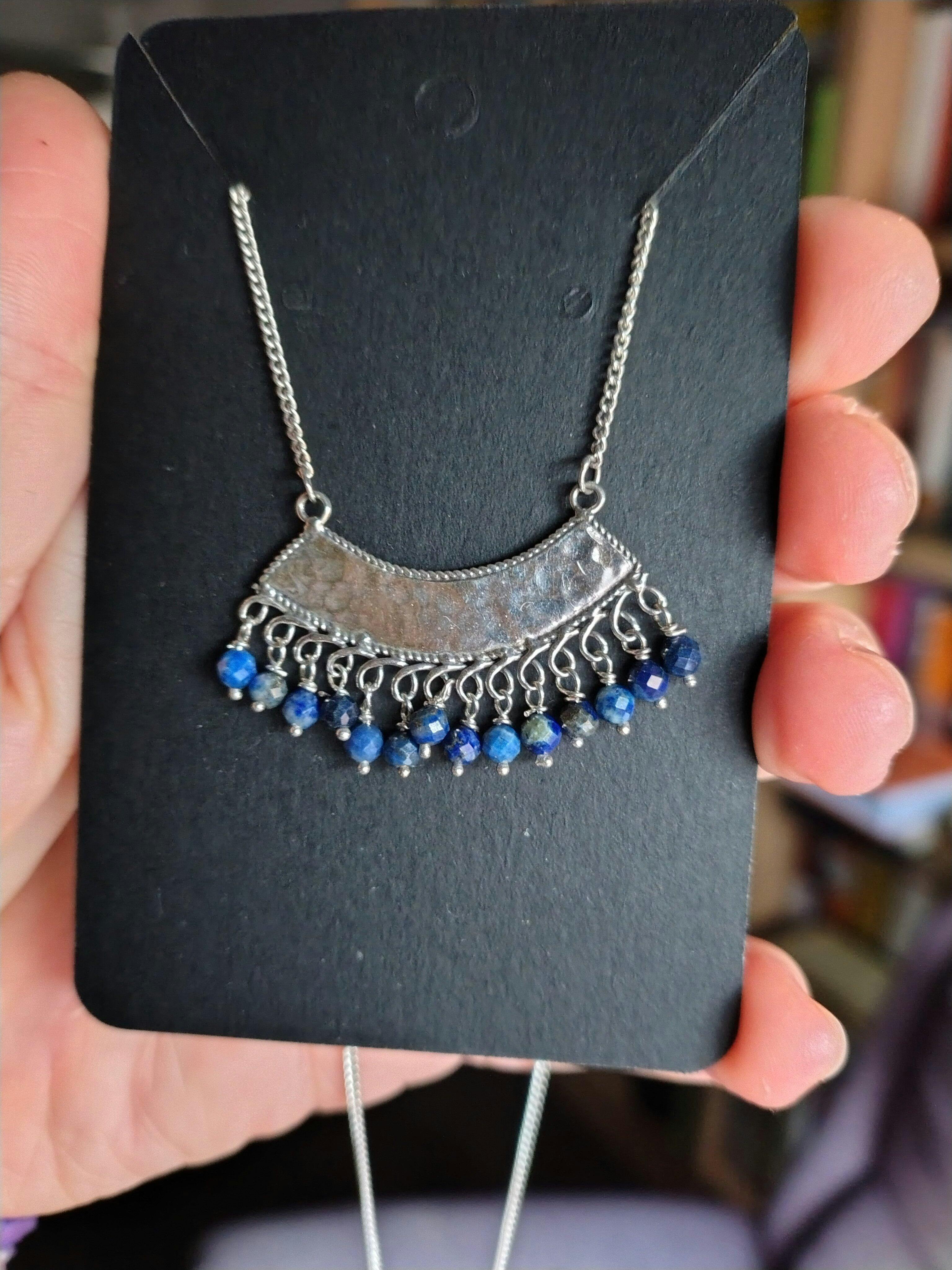 Cada pieza de este collar ha sido confeccionada a mano, colocando una a una sus 14 bolitas de lapislázuli facetado, creando un diseño delicado y lleno de movimiento. La pieza central mide 40 × 25 mm, con una base de plata brillante que ilumina y enmarca el azul profundo característico del lapislázuli.