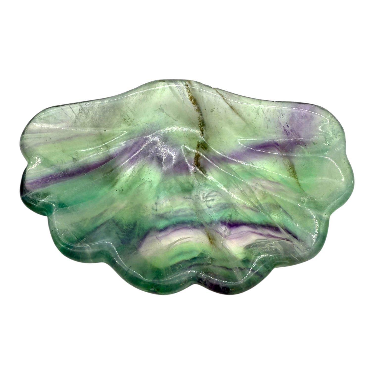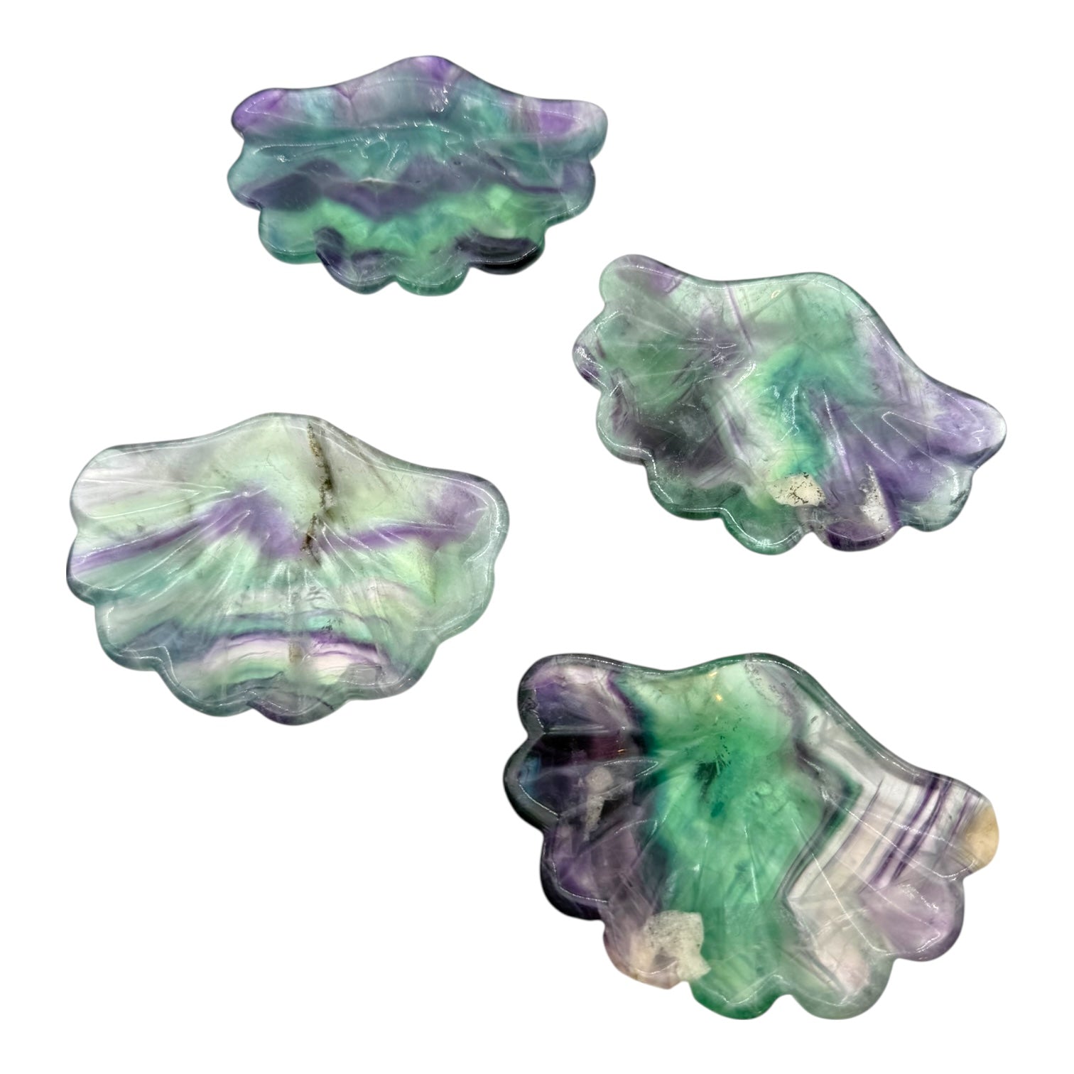 Cada concha de fluorita es una obra maestra mineral, tallada con delicadeza para resaltar los matices verdes, violetas y azules que caracterizan esta piedra mágica.