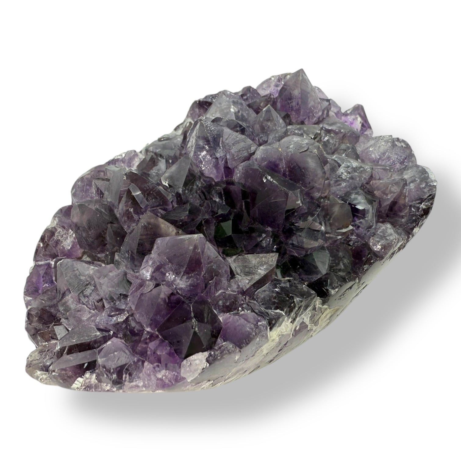 Esta drusa de amatista es una pieza única e irrepetible, formada por un conjunto de cristales que emergen en armonía desde su base natural. Sus cavidades le otorgan un carácter exclusivo, aportando matices y texturas que la convierten en un verdadero tesoro de la Tierra.