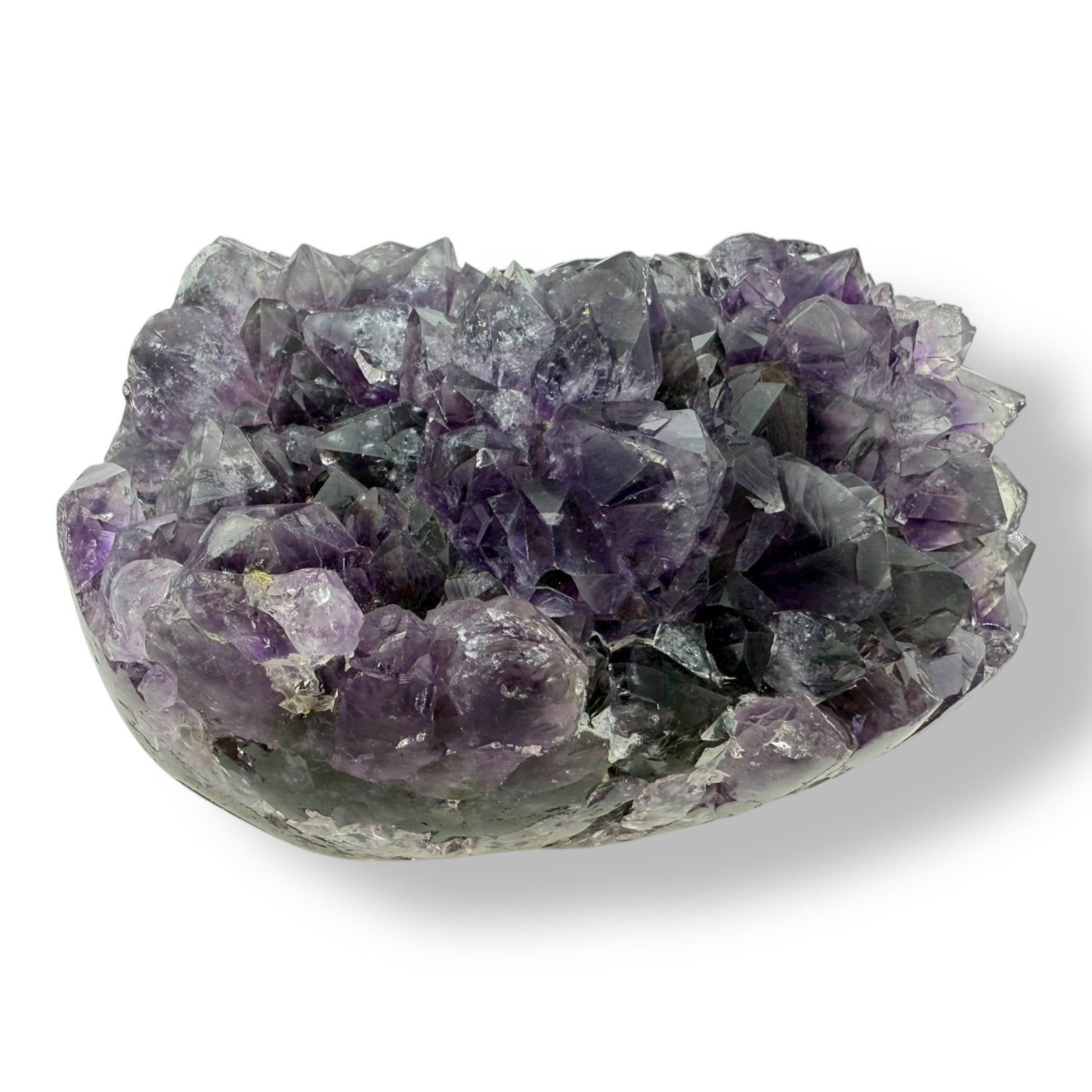 La amatista es conocida como la piedra de la calma y la espiritualidad, y en forma de drusa potencia su capacidad para irradiar energía en todas direcciones, purificando y armonizando el ambiente en el que se encuentra.