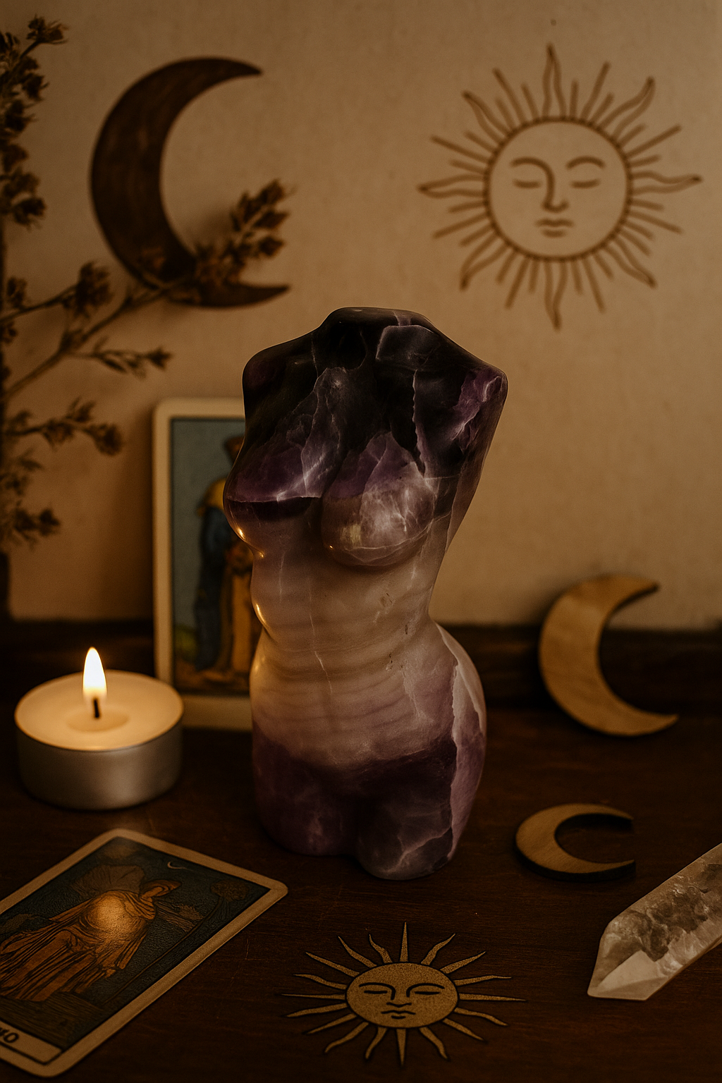 Estas exquisitas esculturas de Fluorita Arcoíris representan el cuerpo femenino con delicadeza y armonía, evocando la belleza de una diosa. Cada pieza está tallada a mano con sumo cuidado, resaltando las curvas naturales y los matices multicolor de la fluorita. Con 13 cm de alto y 6,5 cm de ancho y un peso aproximado de 0,546 g, son piezas únicas que fusionan arte, espiritualidad y energía femenina.