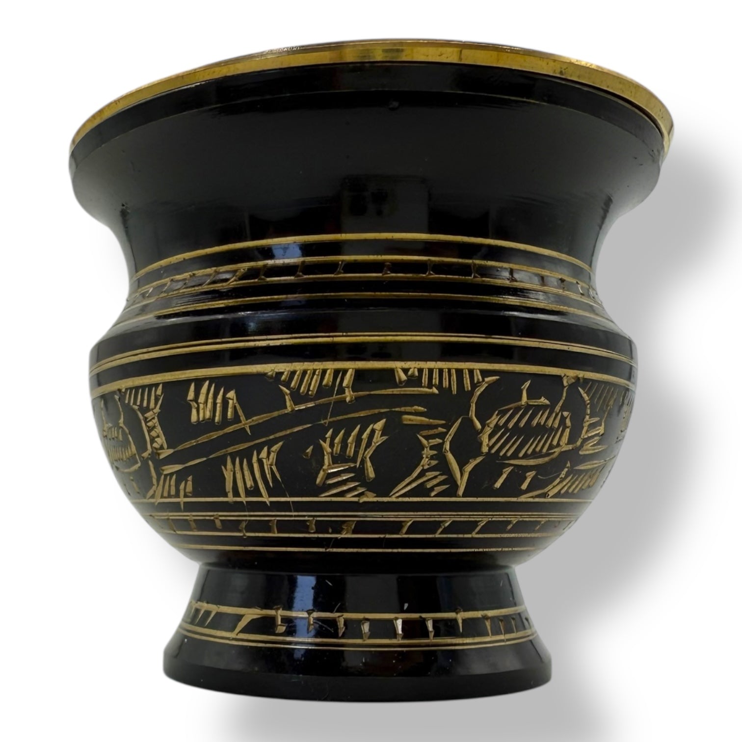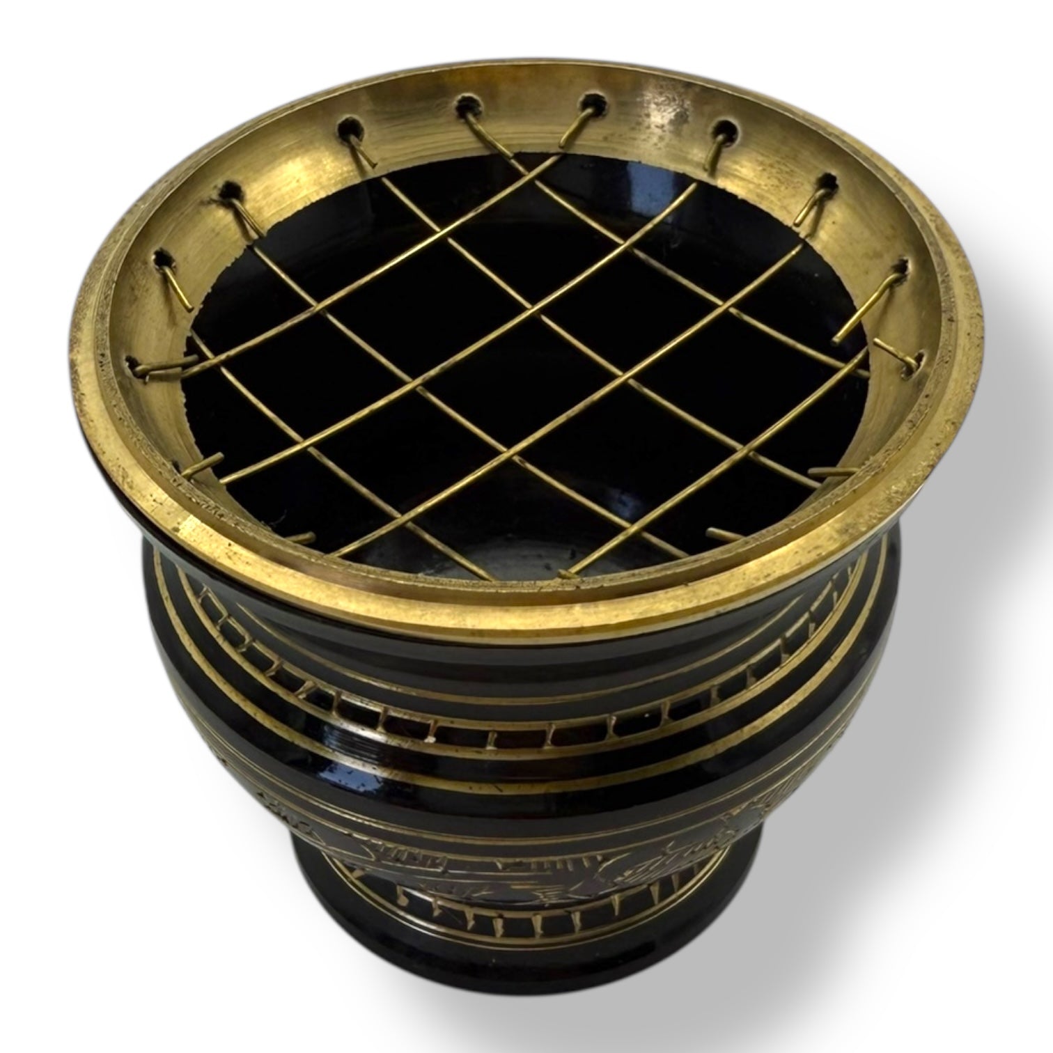 El Incensario India es una pieza artesanal elaborada en India con una aleación de latón y cobre de gran calidad. Su acabado en metal grabado negro le otorga un estilo elegante y tradicional, mientras que la rejilla superior permite quemar inciensos de forma práctica y segura.