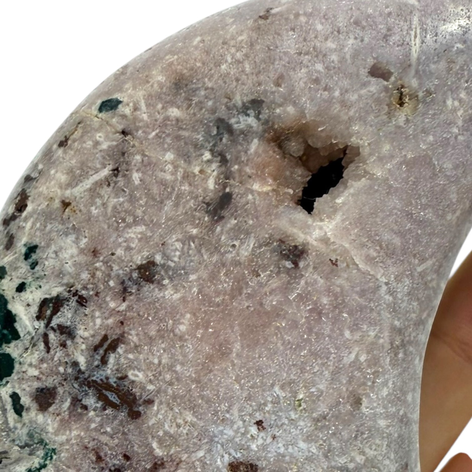 Esta luna de amatista rosa es una pieza preciosa y única, tallada cuidadosamente para resaltar la dulzura de sus tonos suaves y el simbolismo lunar. Con su forma curvada, representa los ciclos de la vida, lo femenino sagrado y la conexión con la intuición.
