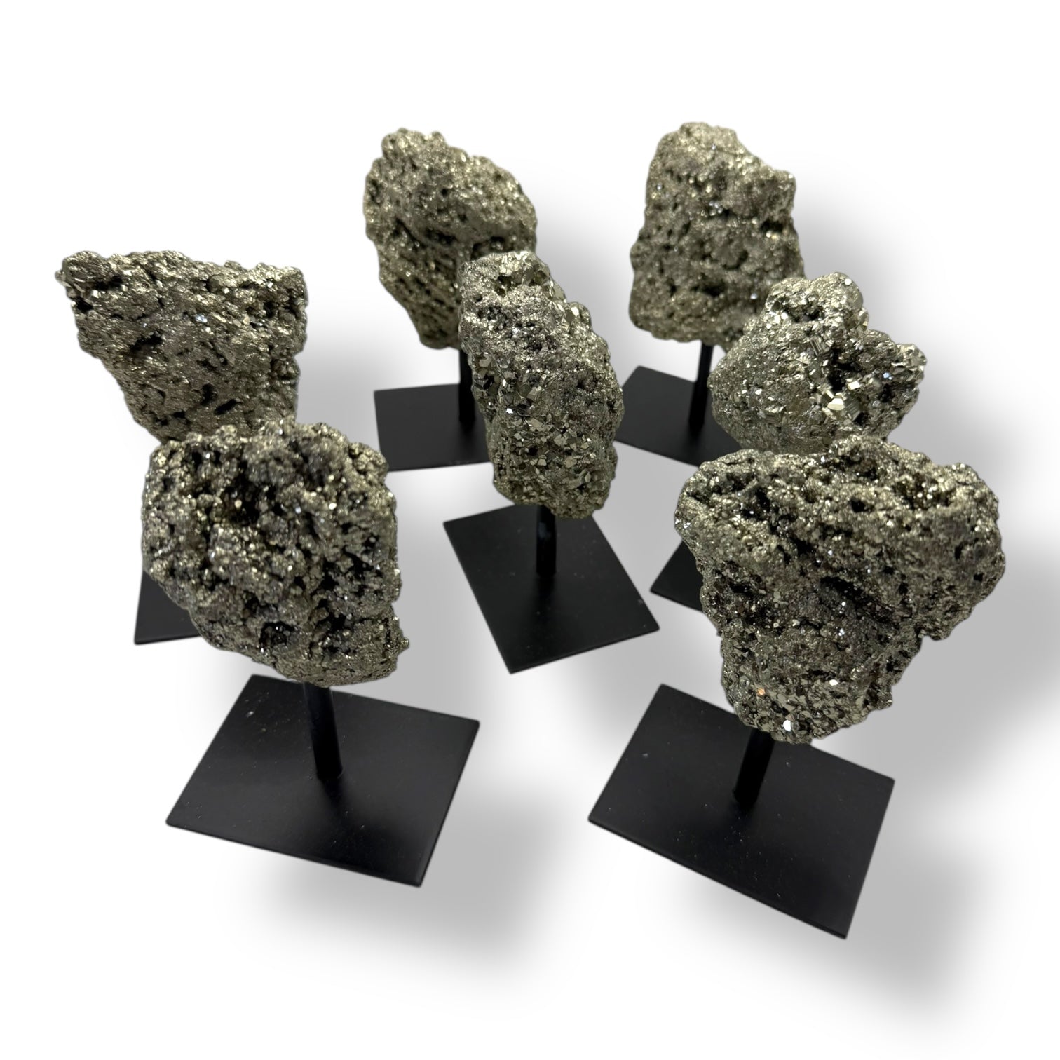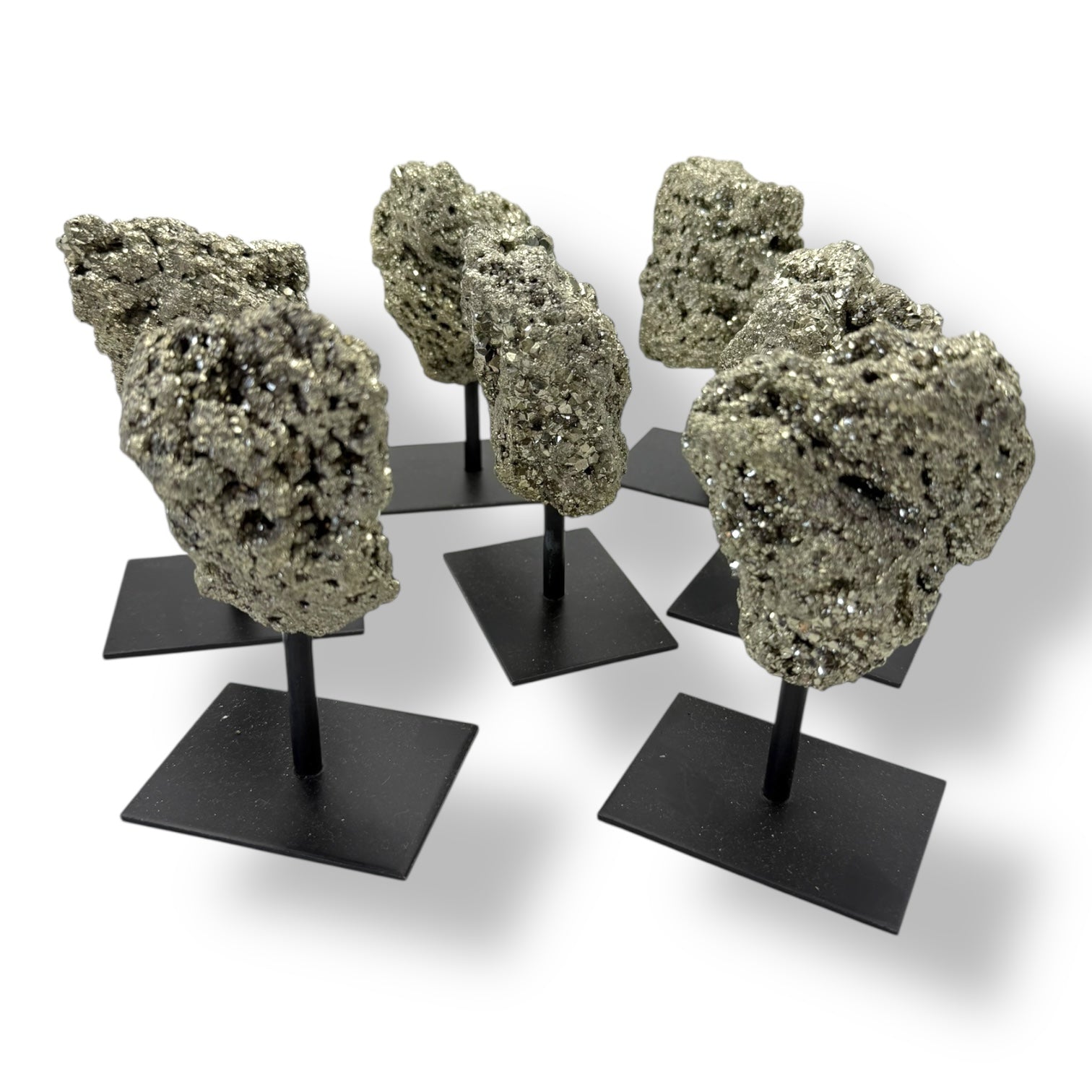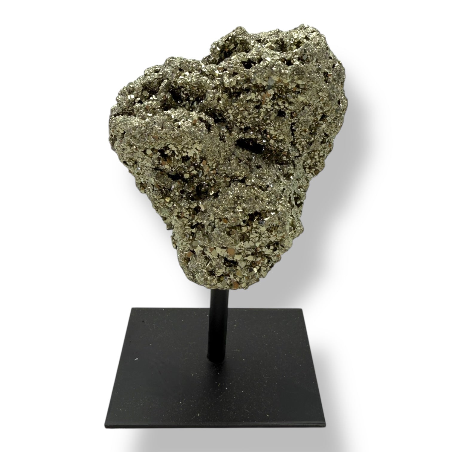 Este masivo de pirita natural de aproximadamente 8 x 8 cm se presenta sobre un elegante pedestal de hierro negro, que realza su brillo metálico dorado y convierte la pieza en un elemento decorativo exclusivo y lleno de energía.