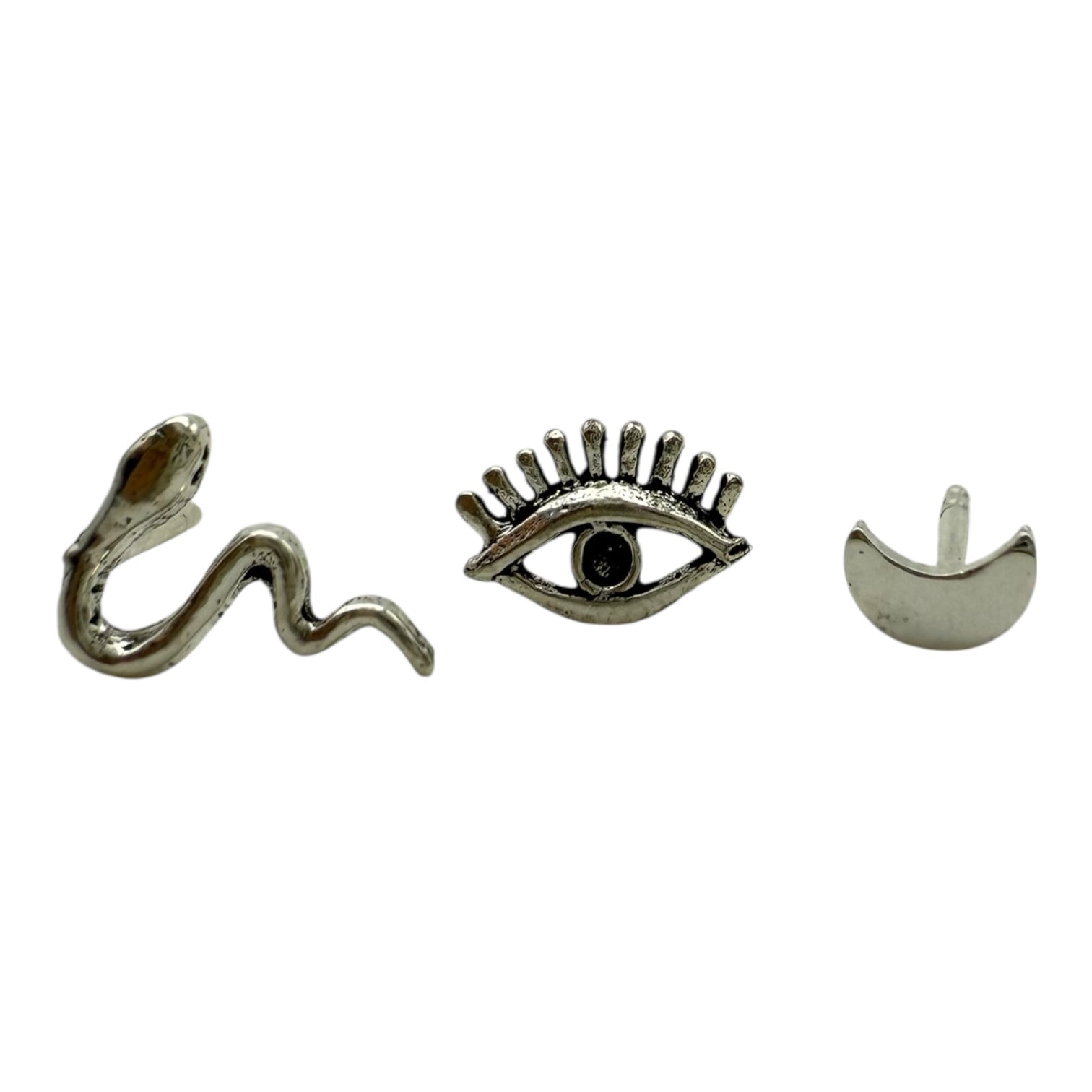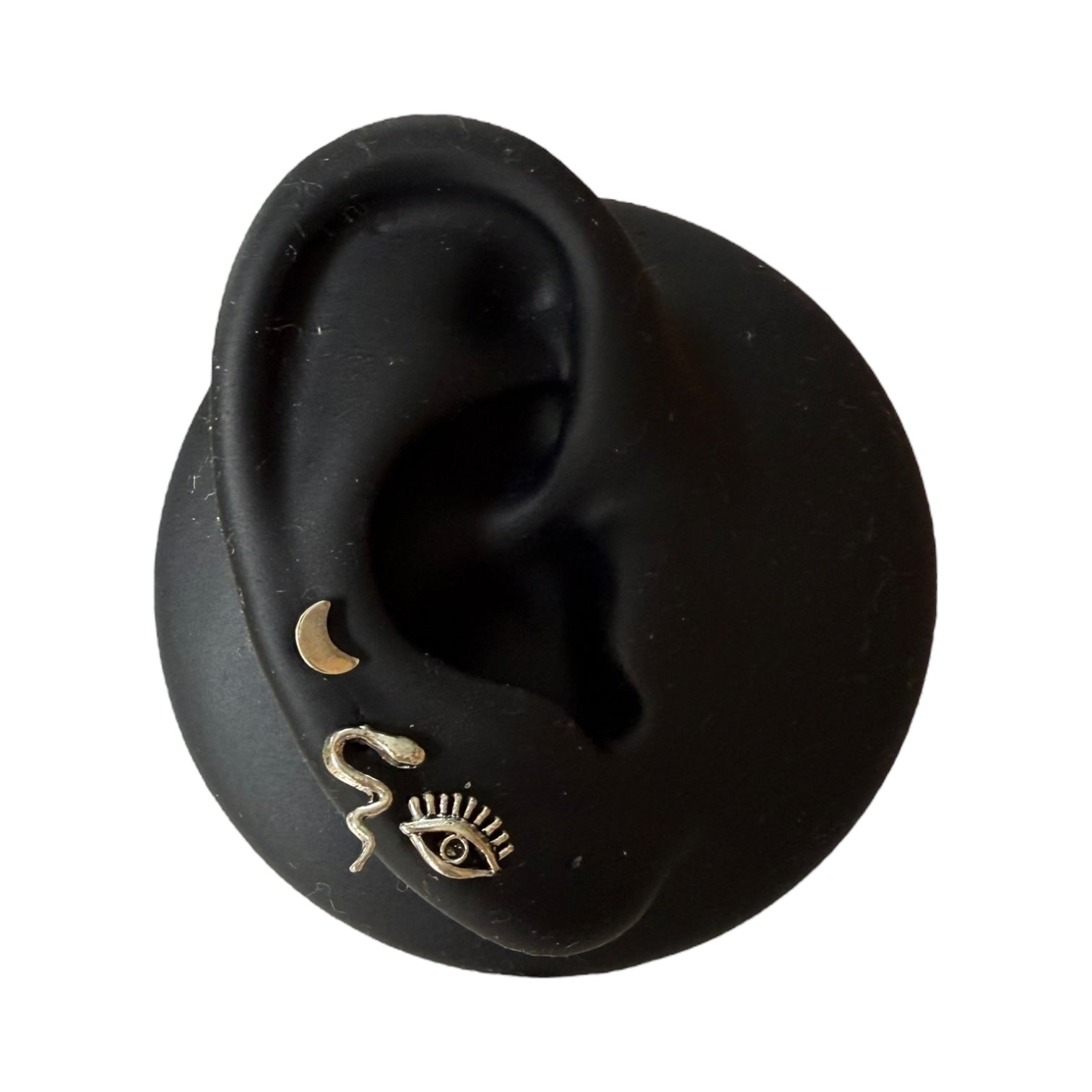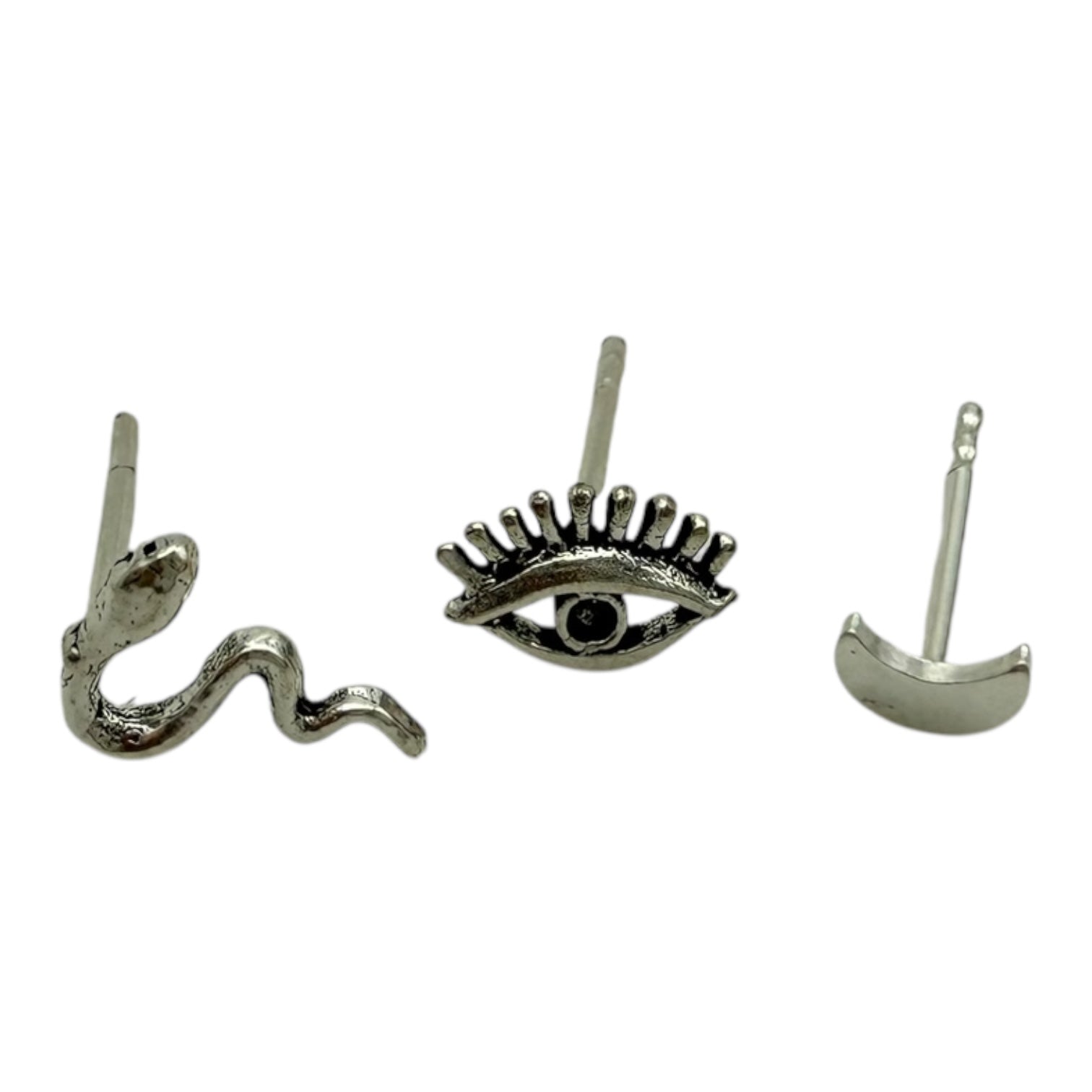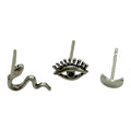 El pack de pendientes Nyx reúne tres símbolos cargados de poder y significado: un ojo, una serpiente y una luna, todos elaborados en plata de ley 925. Inspirados en la diosa de la noche en la mitología griega, estos pendientes evocan misterio, intuición y protección.