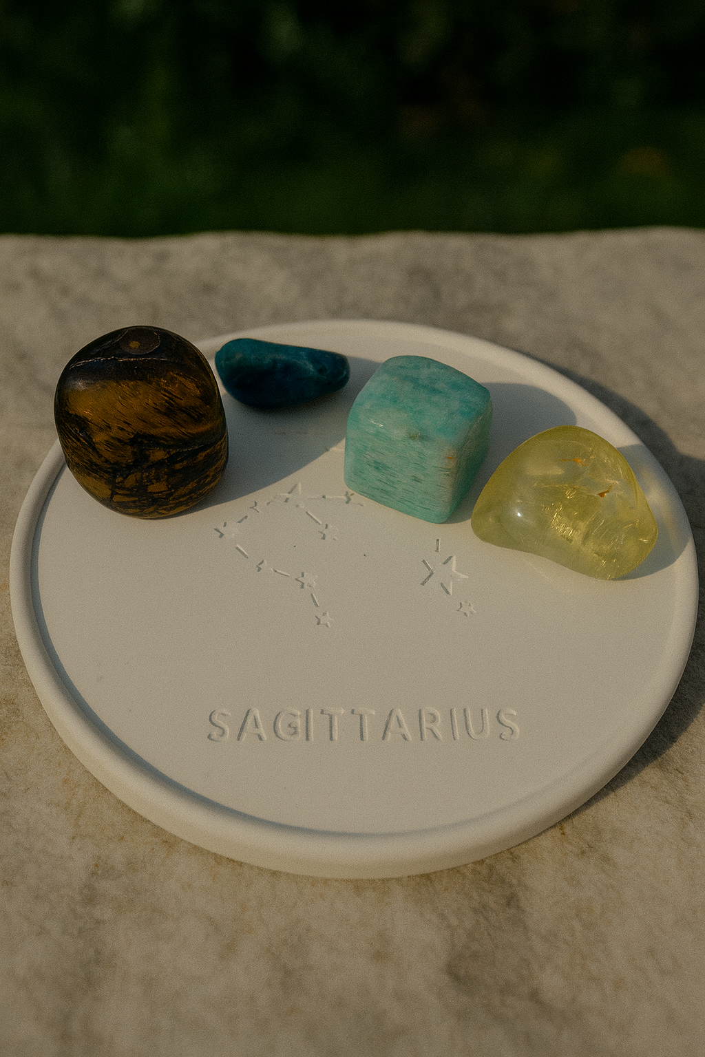 Hecha a mano, con la constelación de Sagitario grabada. Ideal para colocar las piedras, crear un altar energético o decorar tu espacio con un toque vibrante y aventurero.