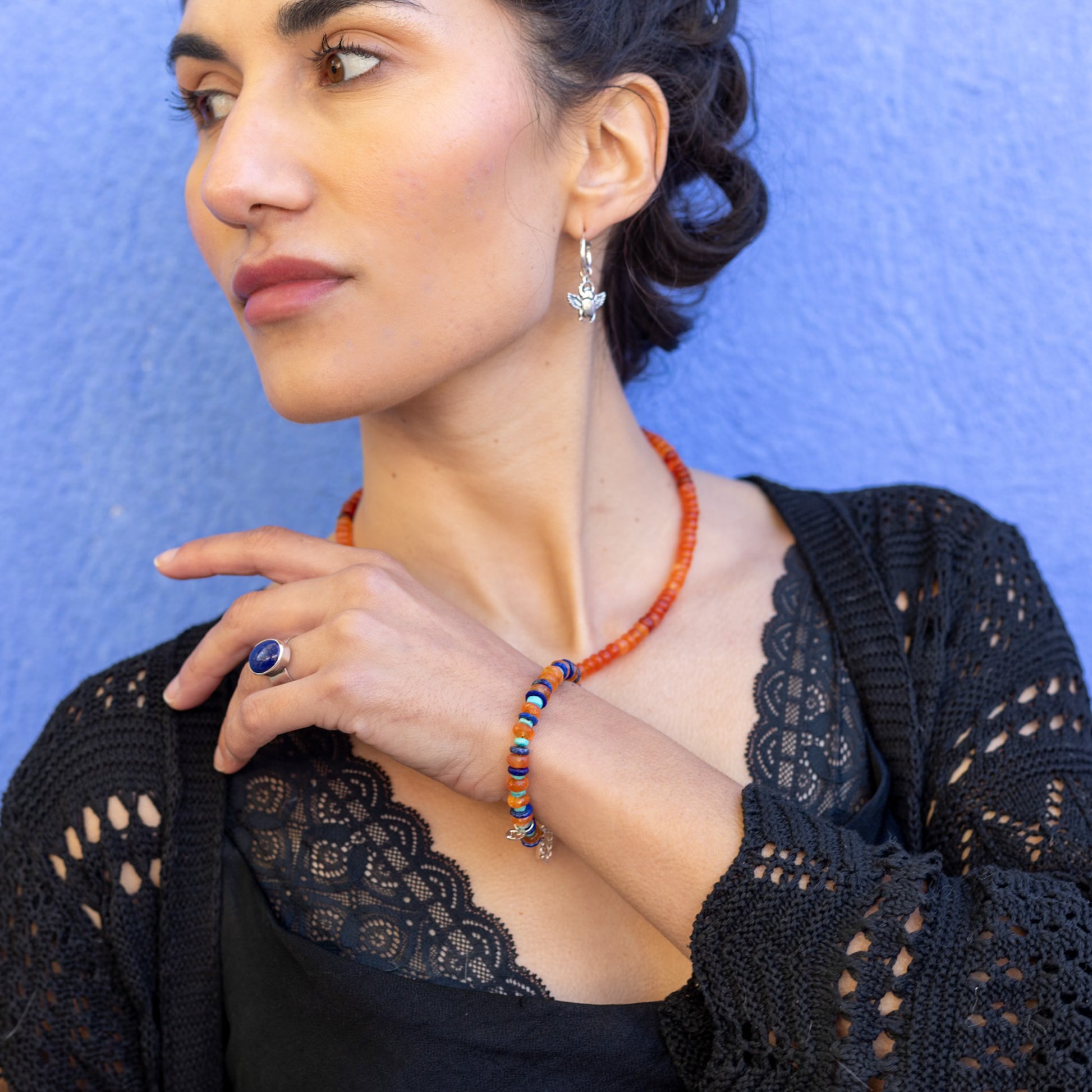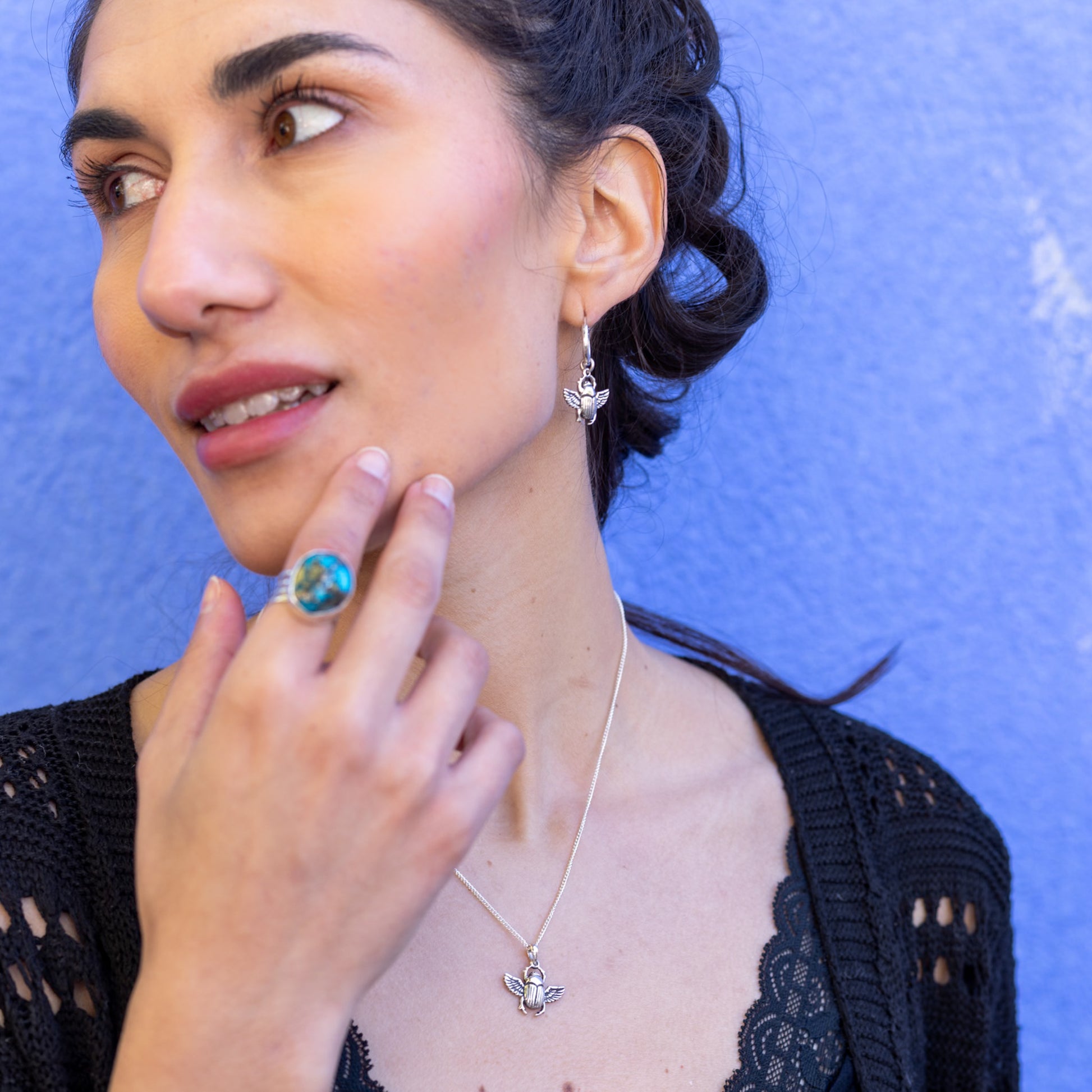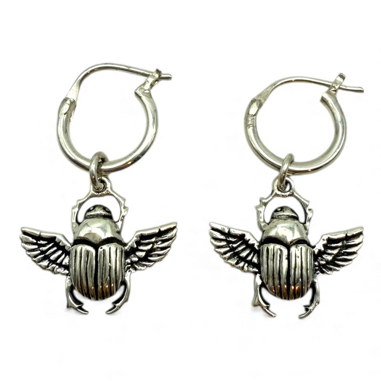 Cada escarabajo está elaborado en plata de ley 925, detallado y simbólico, y cuelga de un arito con cierre a presión, cómodo, seguro y pensado para uso diario. Son piezas ligeras, elegantes y llenas de presencia energética, que unen la magia del antiguo Egipto con la delicadeza de una joya moderna.