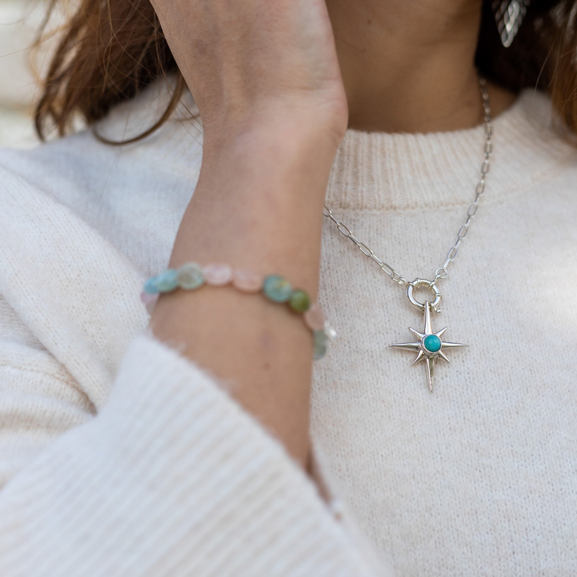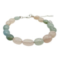 Compuesta por piedras de berilo natural en tonalidades suaves —aguamarina, morganita, heliodoro y goshenita—, cada gema ovalada de 10 x 8 mm ha sido seleccionada con intención y ensamblada a mano con cierre de plata de ley 925.