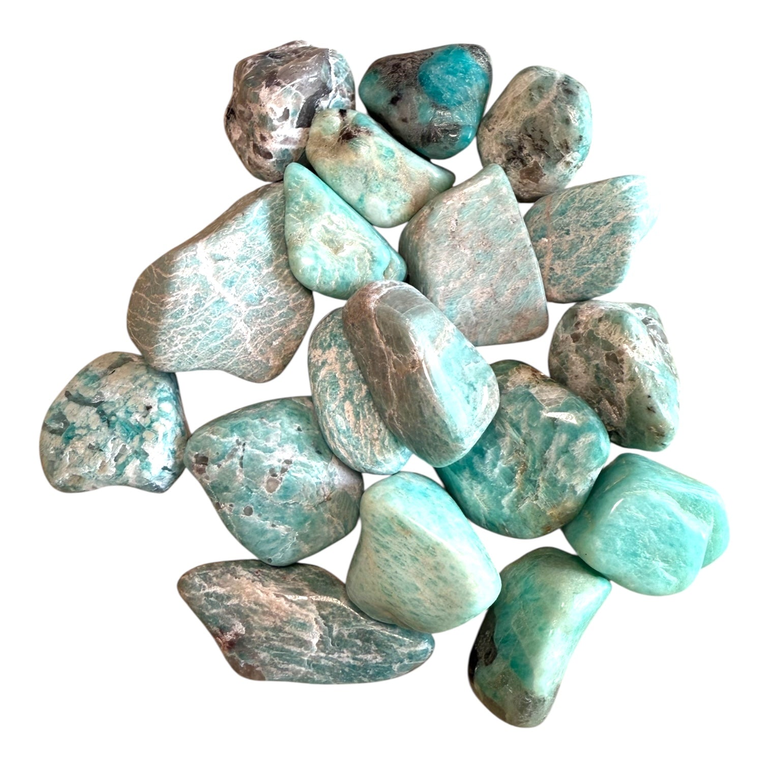 El rodado extra de Amazonita es una piedra semipreciosa muy apreciada por su energía calmante y sus bellos tonos que van del verde al turquesa. Conocida como la piedra de la verdad y la armonía, la amazonita ha sido utilizada desde la antigüedad como amuleto de paz, protección y comunicación sincera.