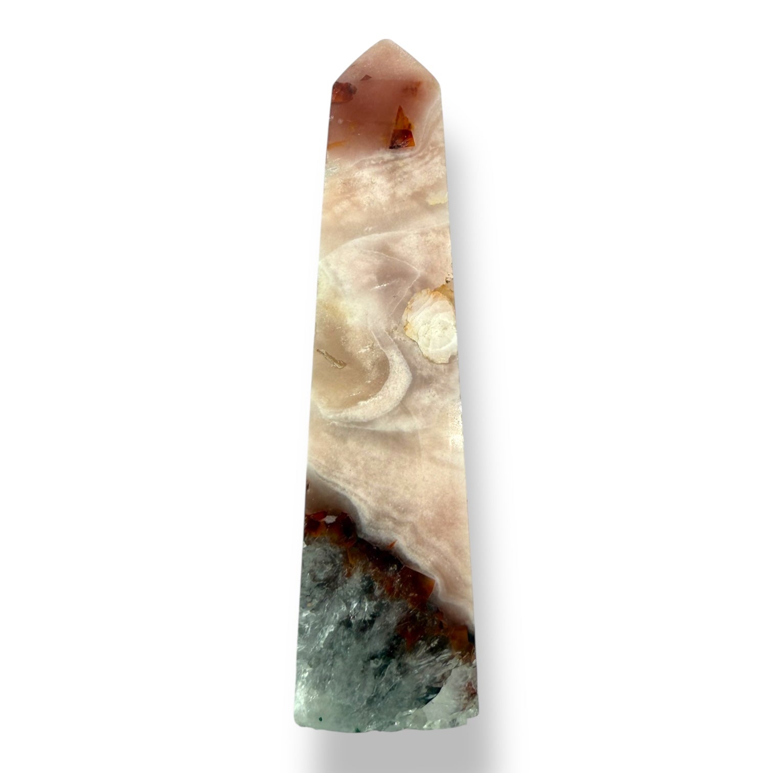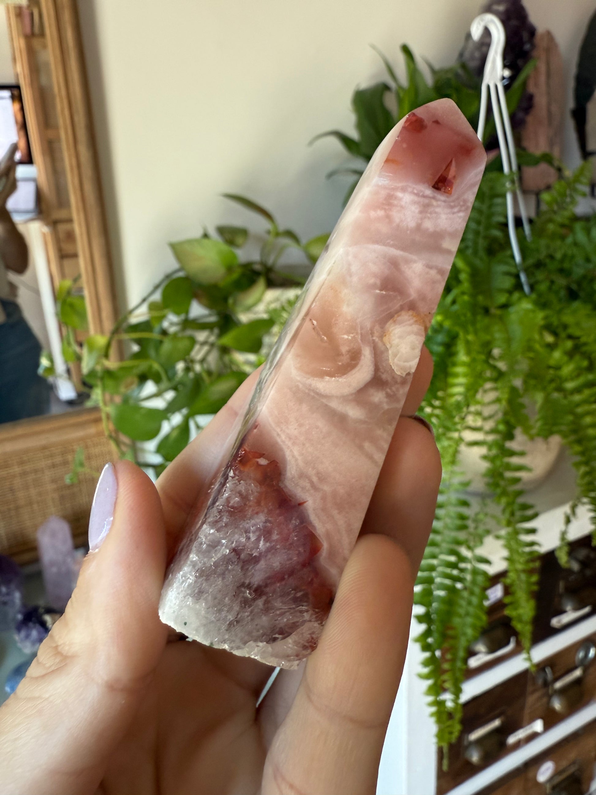 Esta torre de amatista rosa es una pieza única y excepcional, tallada para potenciar y dirigir la energía hacia lo más alto. Su tonalidad suave y delicada refleja la unión perfecta entre la fuerza espiritual de la amatista y la ternura del cuarzo rosa.