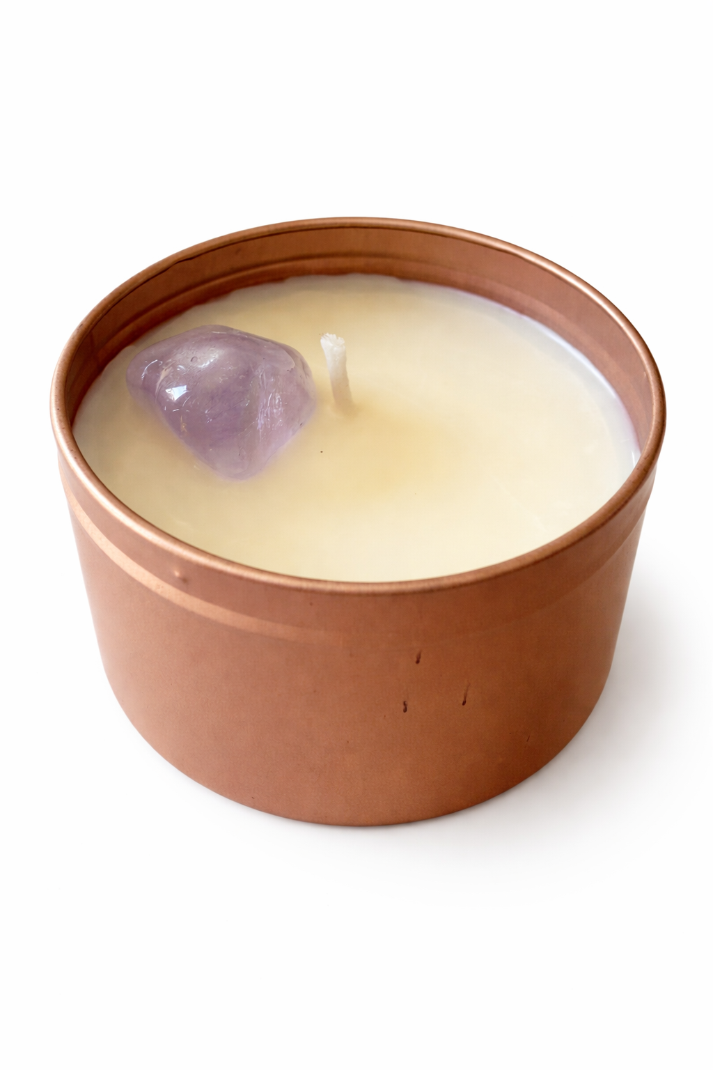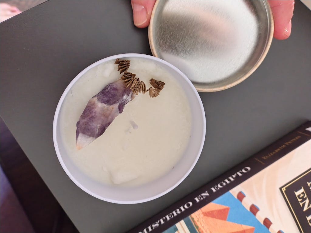 En su interior, una punta natural de amatista vibra con una energía serena y protectora, guiando tus pensamientos hacia la calma, la intuición y la conexión espiritual. Encender Luz del Alba es abrir un espacio de introspección y belleza, ideal para rituales, meditaciones o momentos en los que simplemente necesitas volver a ti. Una vela para anclar luz en el presente y sembrar intención en cada amanecer.