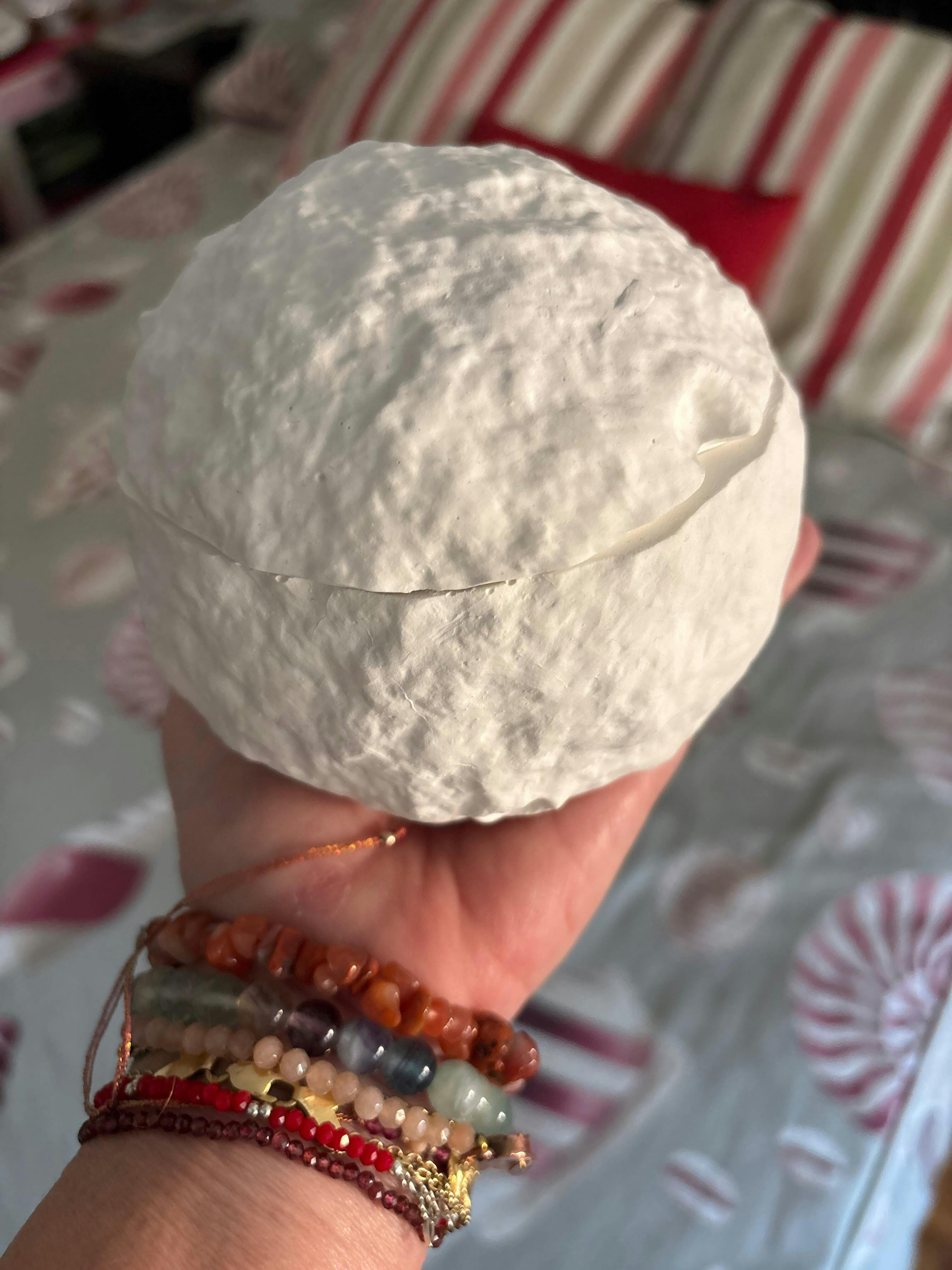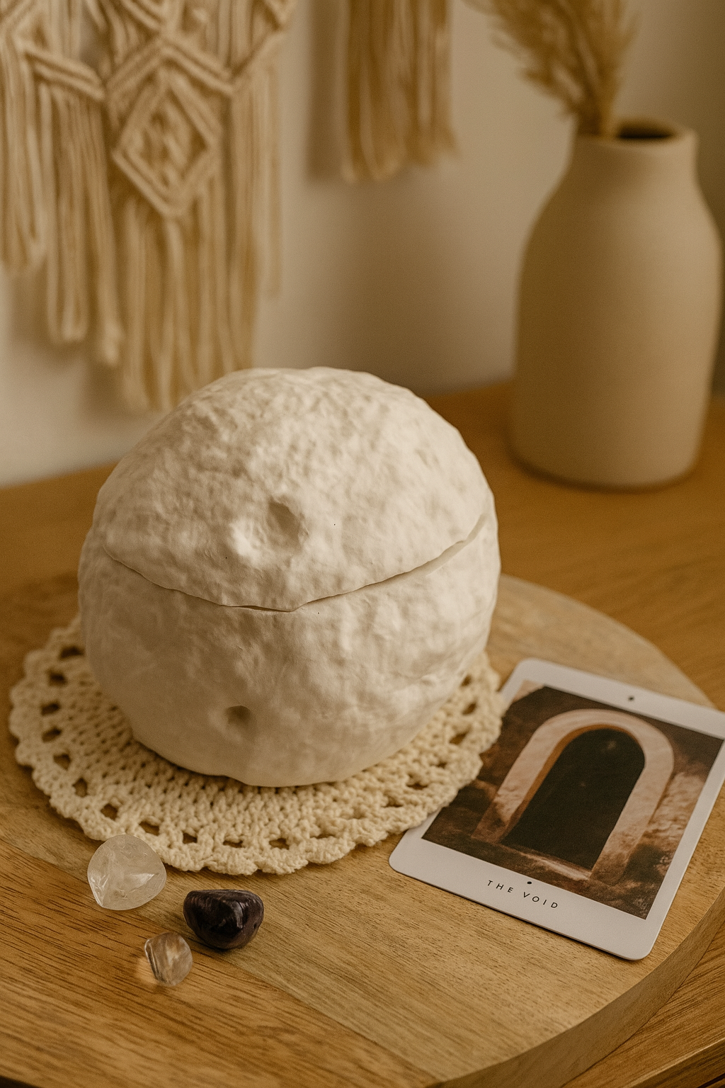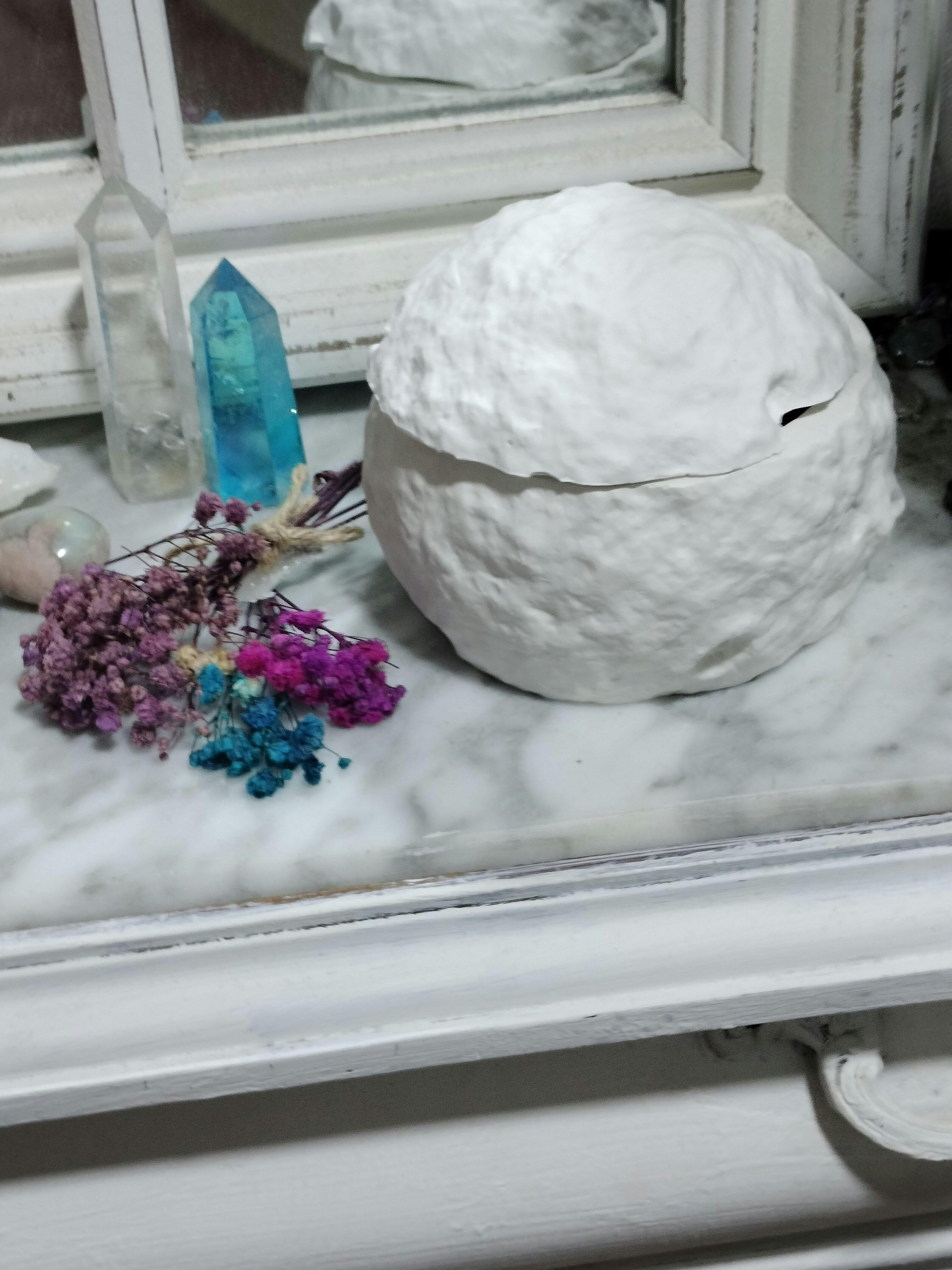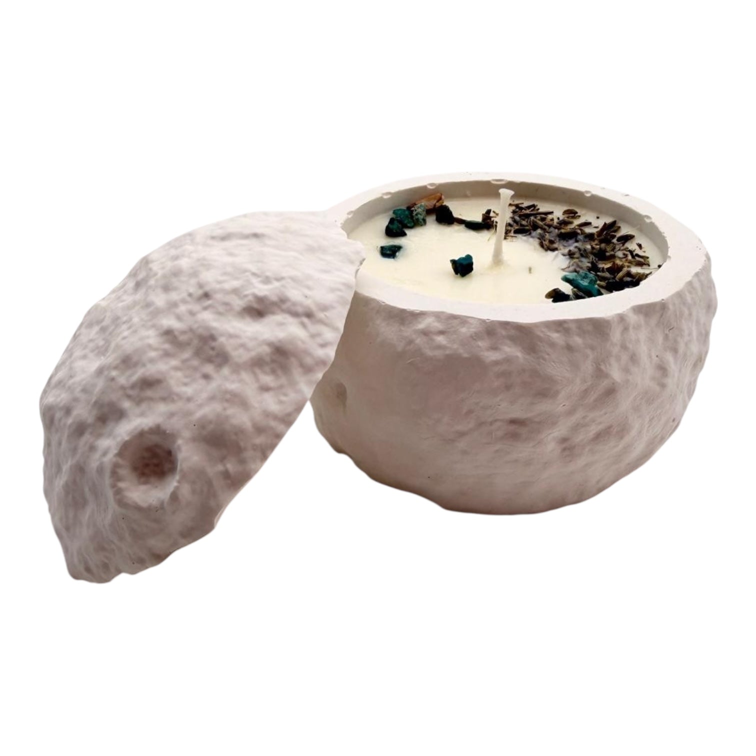 El recipiente de resina vegetal con tapa, de 9 cm de ancho por 10 cm de alto, se presenta como una luna luminosa, ideal para llenar cualquier espacio de serenidad. Una vez terminada, puedes reutilizarla como joyero, porta inciensos o recipiente decorativo, manteniendo viva su energía y belleza.