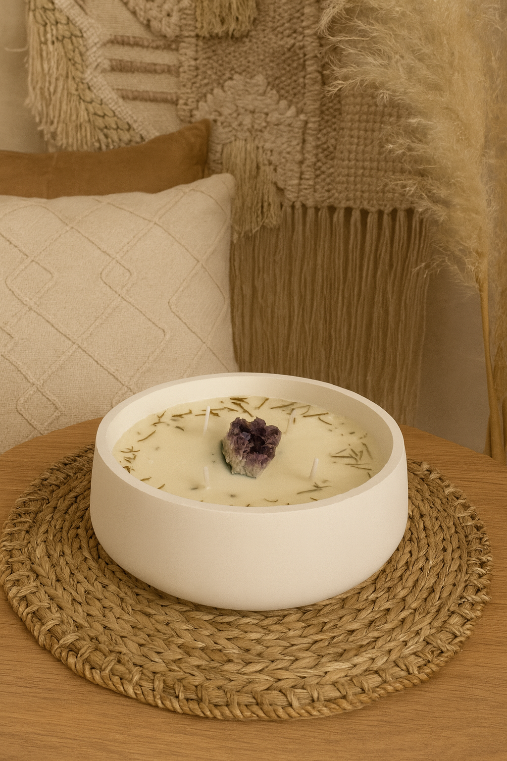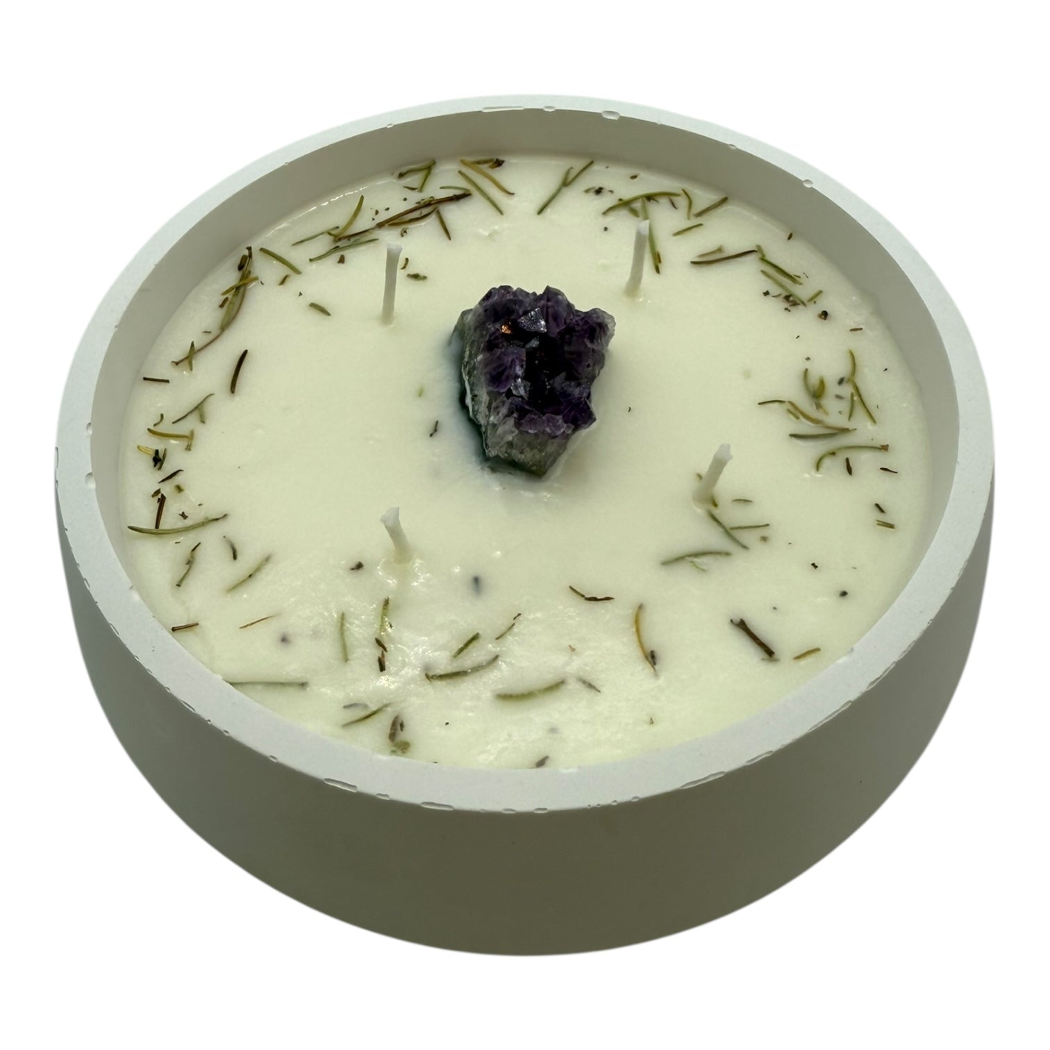 Decoración: Drusa de amatista, hierbas aromáticas y flores secas