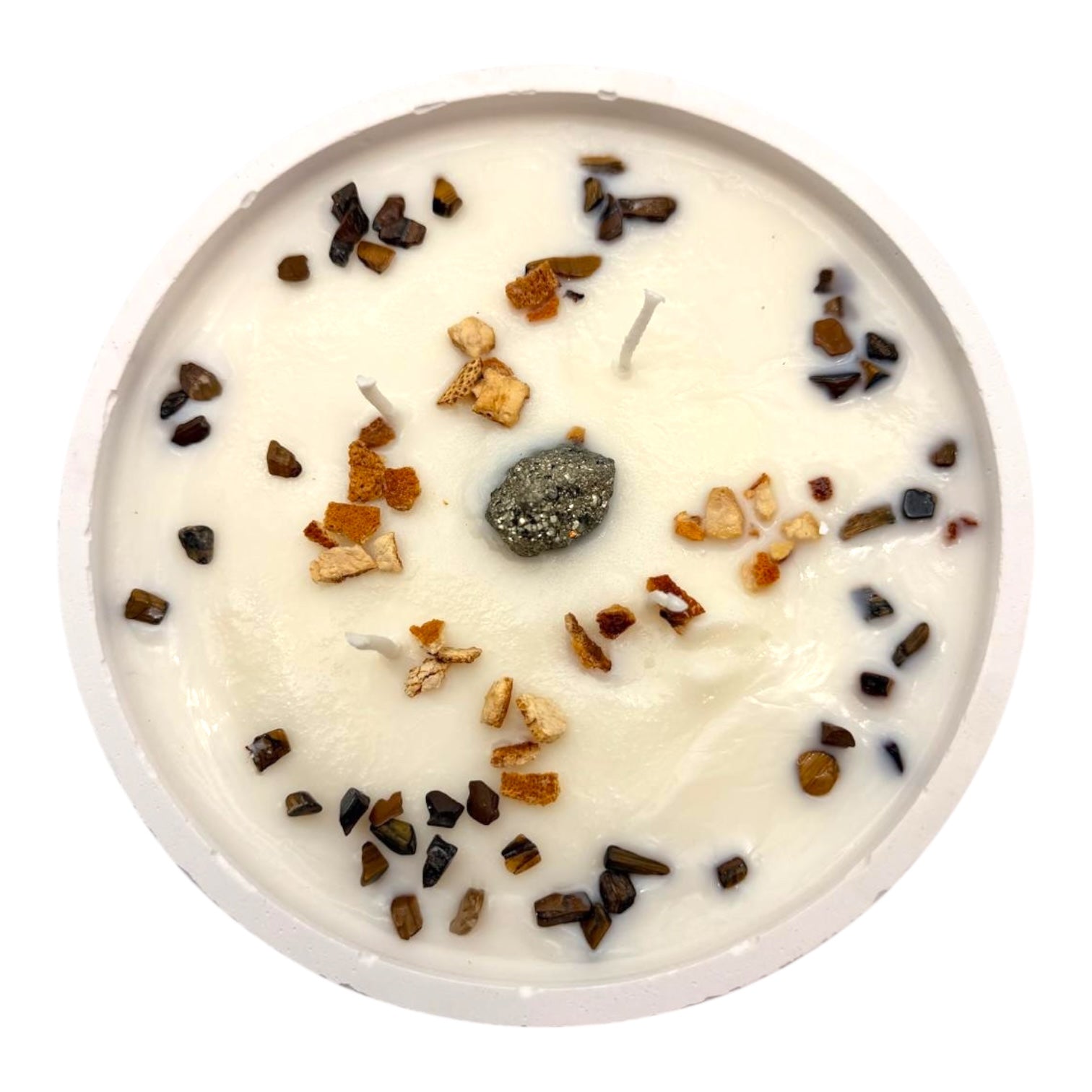 En su interior, descansa una pirita —piedra de prosperidad y abundancia— junto a pequeños chips de Ojo de Tigre, símbolo de protección, coraje y claridad.